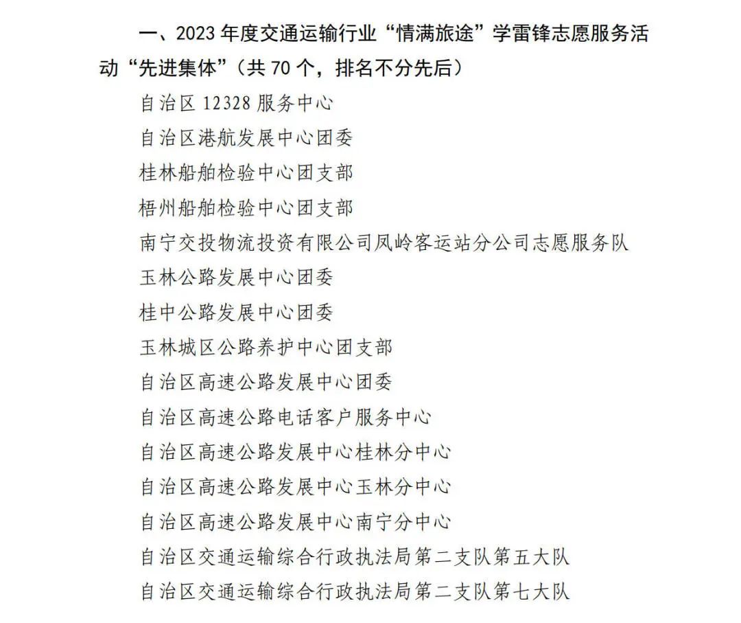 近日,自治区交通运输厅公布2023年度交通运输行业“情满旅途”学雷锋志愿服务活动“先进集体”“先进个人”名单,全区交通运输行业70个集体和,100名个人上榜。一起来看看,TA们都是谁