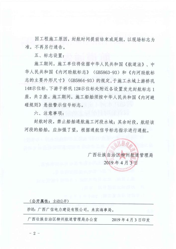 关于贡模~望楼110kV线路工程跨越红水河(贡模段)施工期间航道封航的航道通告