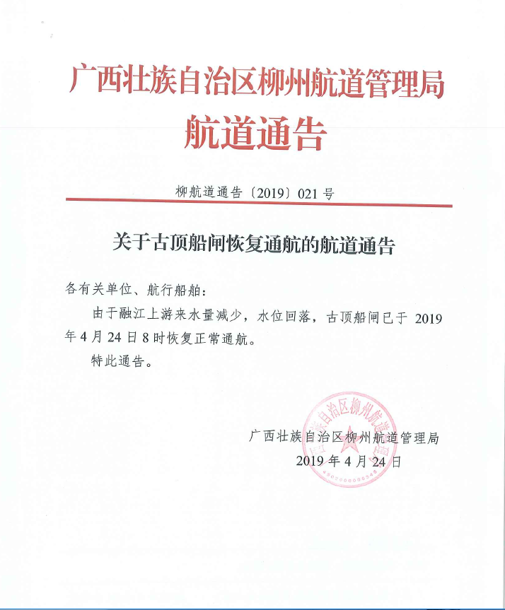 关于古顶船闸恢复通航的航道通告