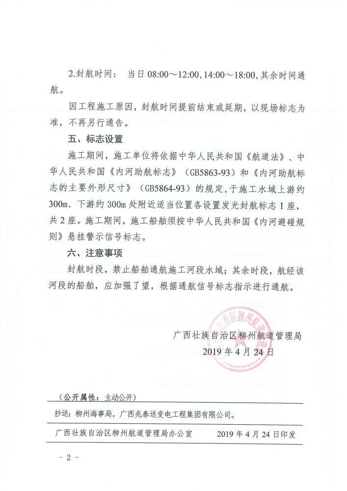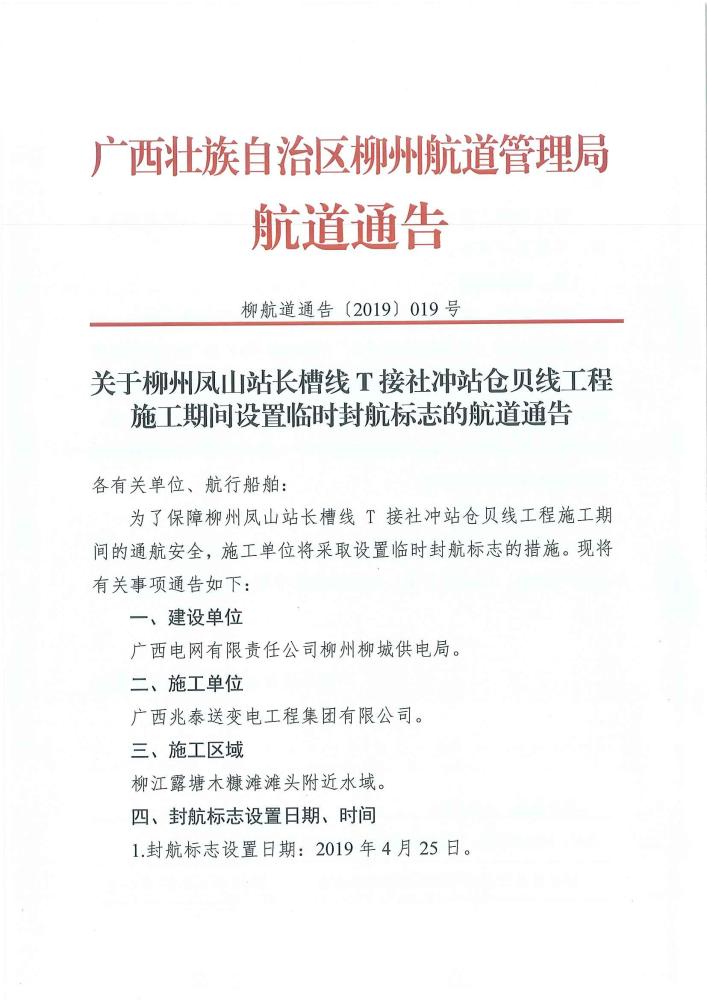关于柳州凤山站长槽线T接社冲站仓贝线工程施工期间设置临时封航标志的航道通告