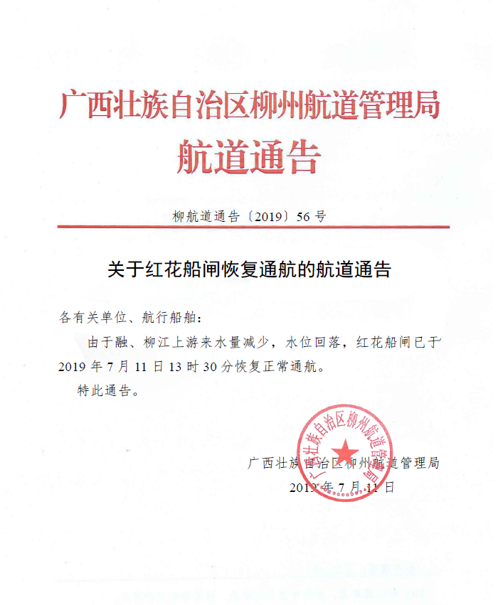 红花船闸恢复通航的通告