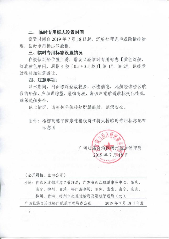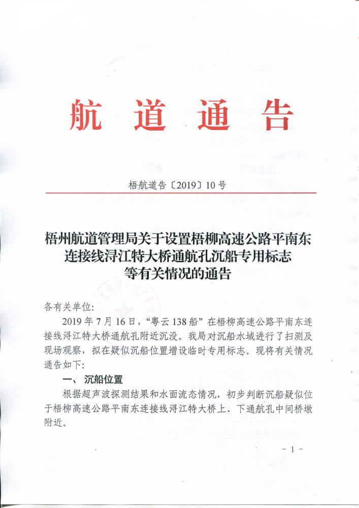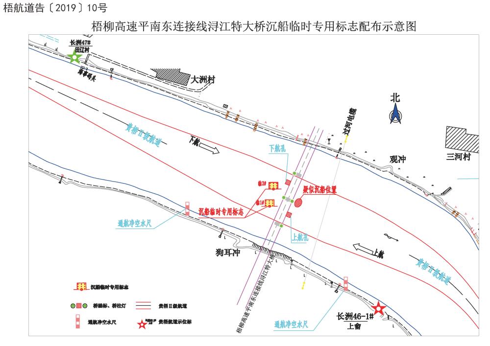 梧州航道管理局关于设置梧柳高速公路平南东连接线浔江特大桥通航孔沉船专用标志等有关情况的通告
