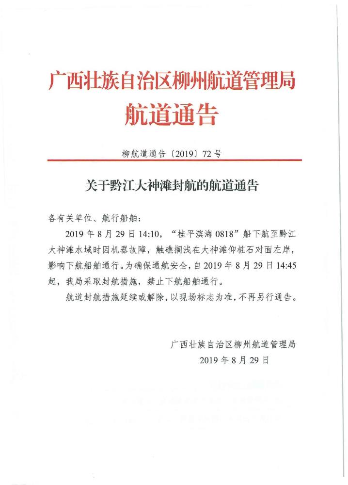 关于黔江大神滩封航的航道通告
