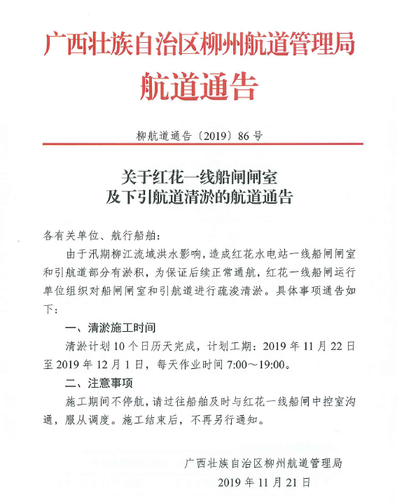 关于红花一线船闸闸室及下引航道清淤的航道通告