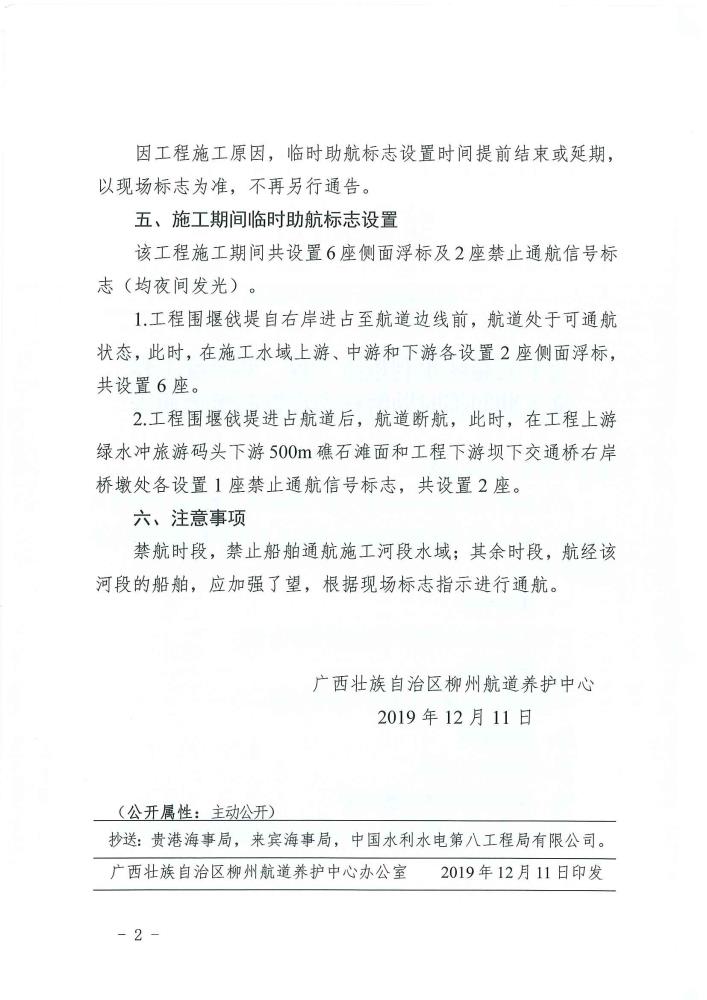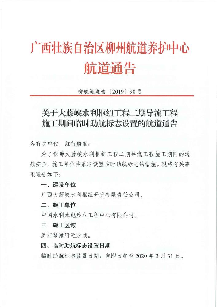 关于大藤峡水利枢纽工程二期导流工程施工期间临时助航标志设置的航道通告