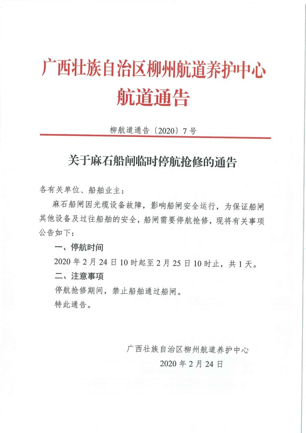 关于麻石船闸临时停航抢修的通告