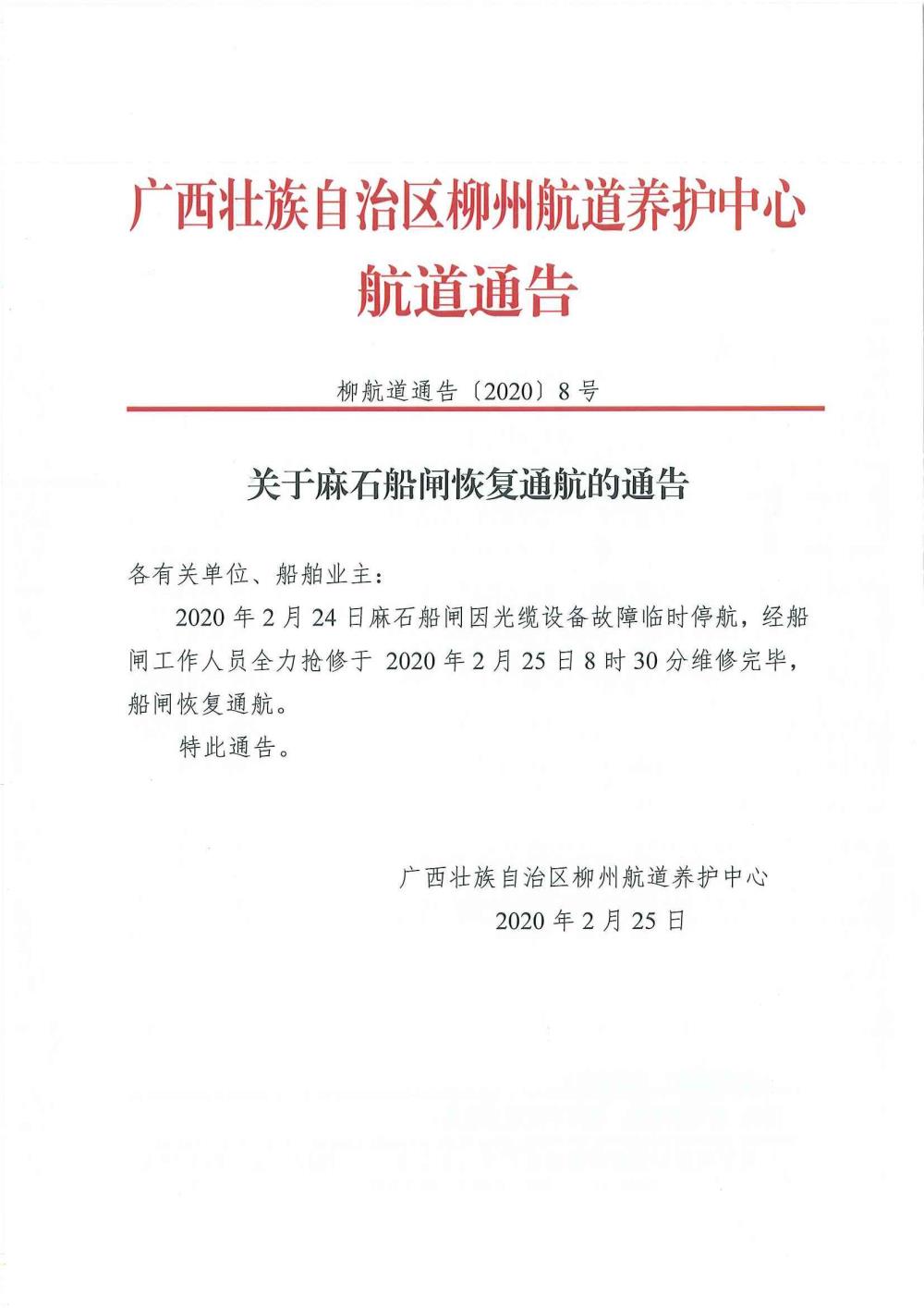 关于麻石船闸恢复通航的通告