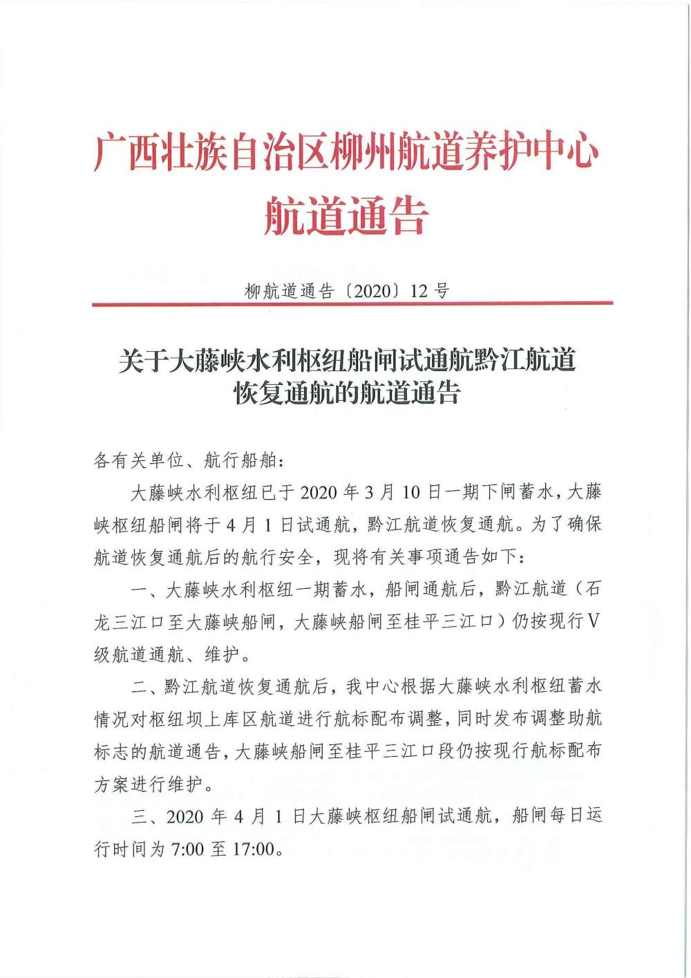 关于大藤峡水利枢纽船闸试通航黔江航道恢复通航的航道通告