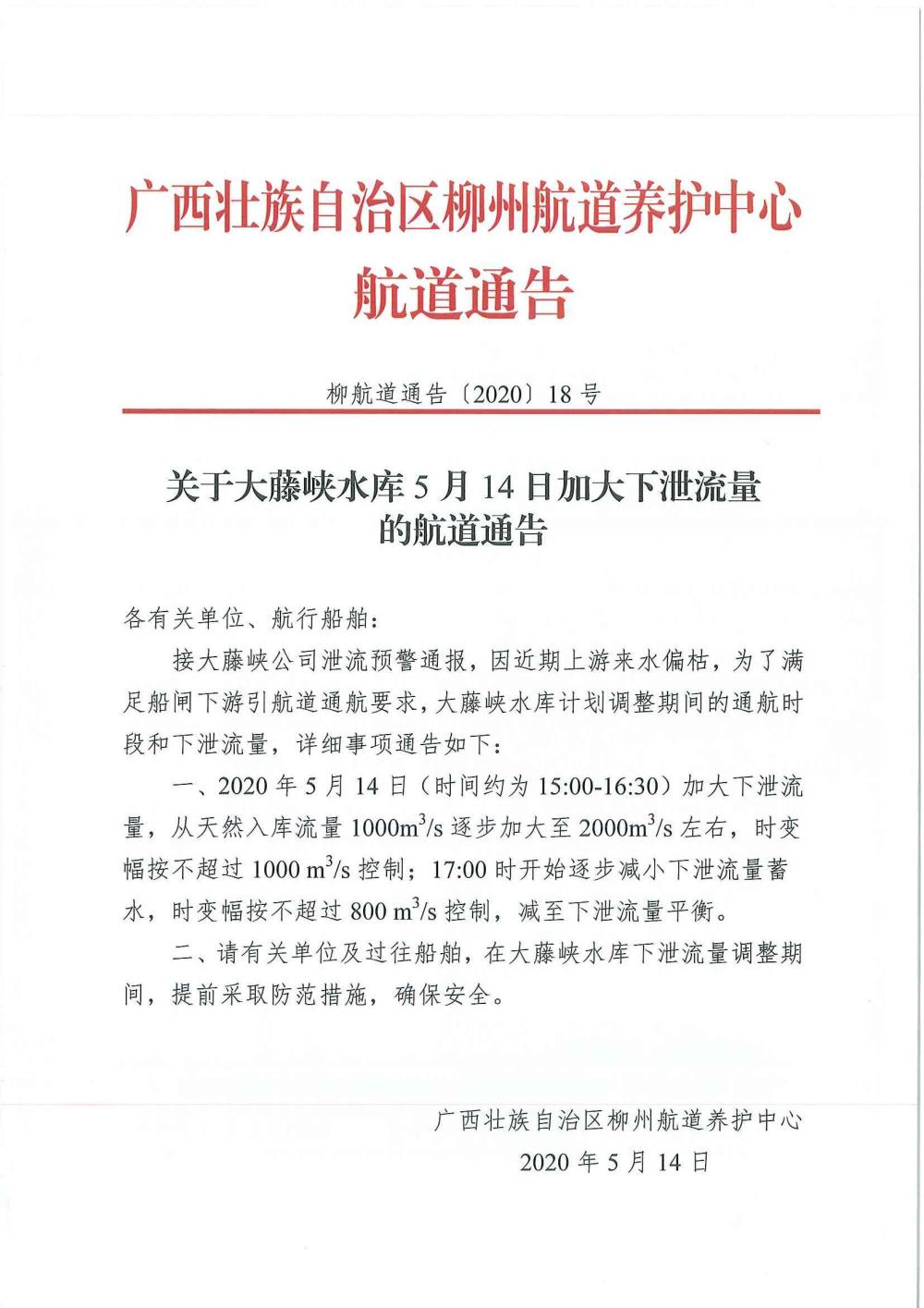 关于大藤峡水库5月14日加大下泄流量的航道通告