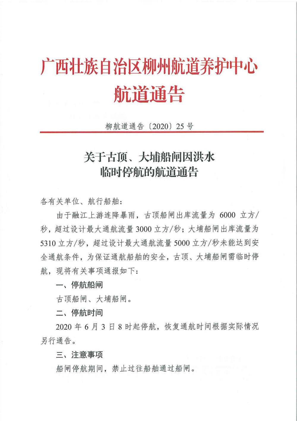 关于古顶、大埔船闸因洪水临时停航的航道通告