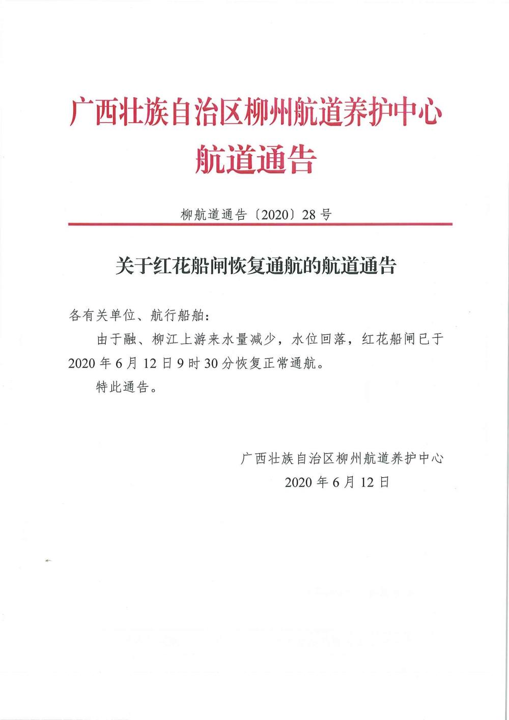 关于红花船闸恢复通航的航道通告