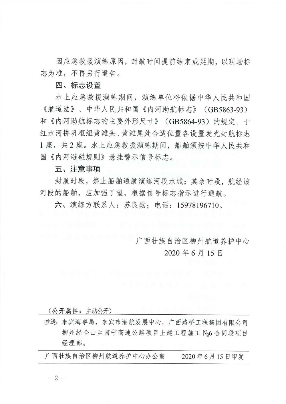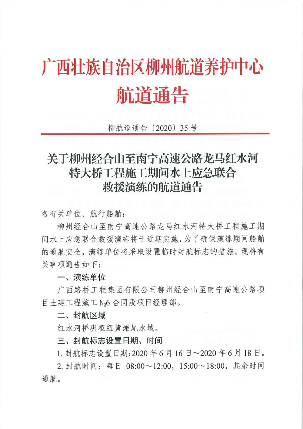 关于红水河龙马大桥桥区施工区域应急封航的航道通告