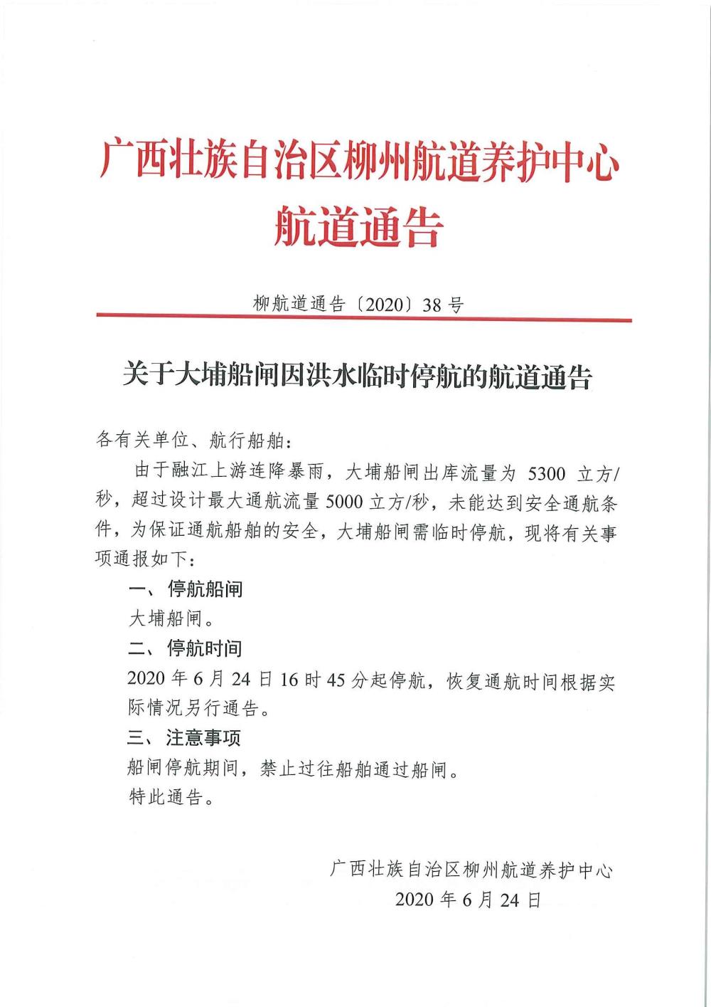 关于大埔船闸因洪水临时停航的航道通告