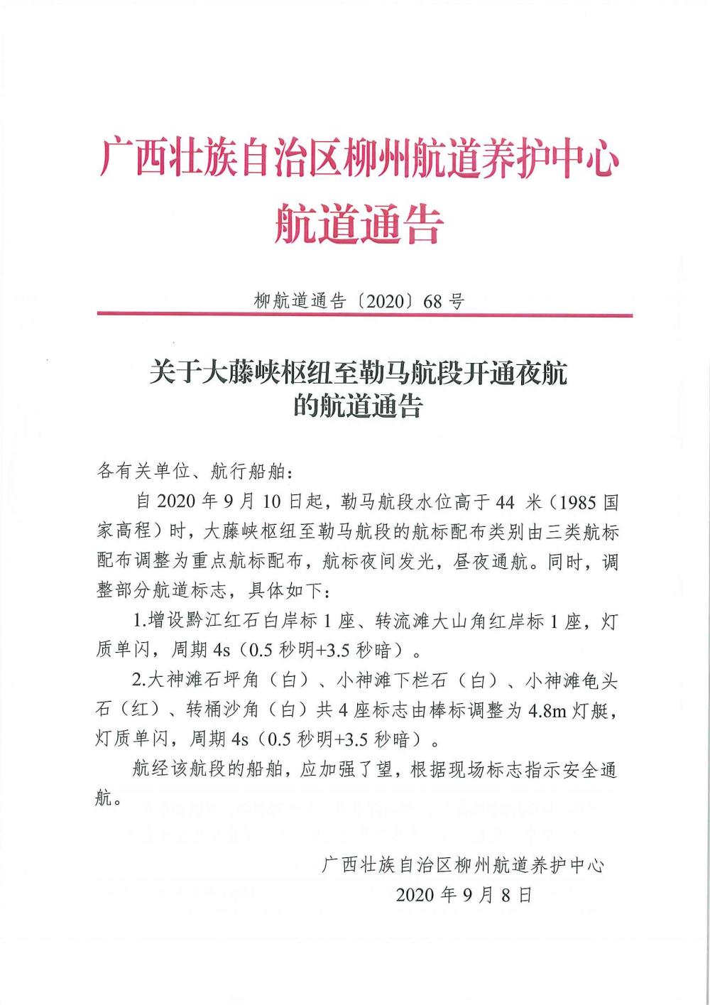 关于黔江大藤峡枢纽至勒马航段开通夜航的航道通告