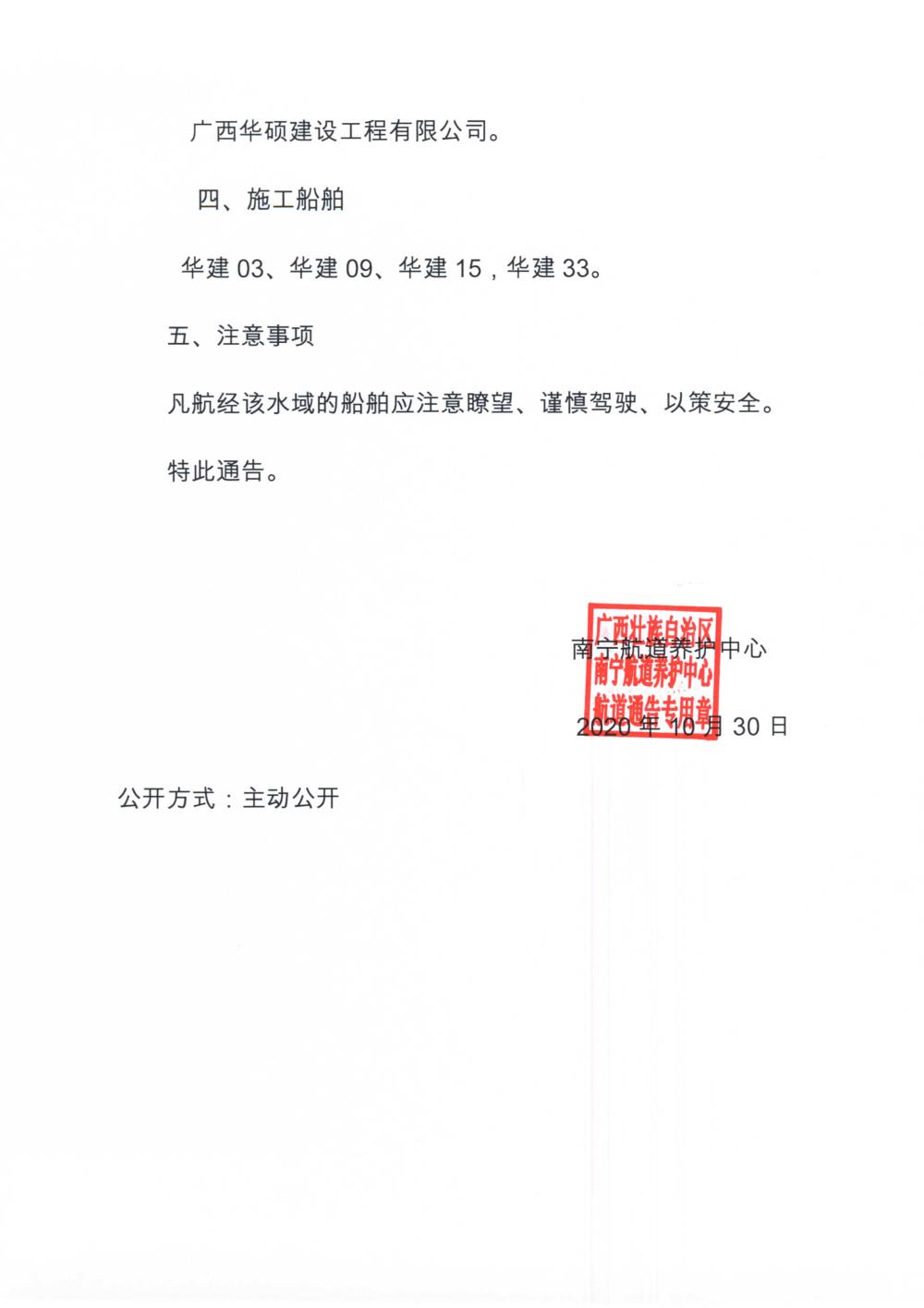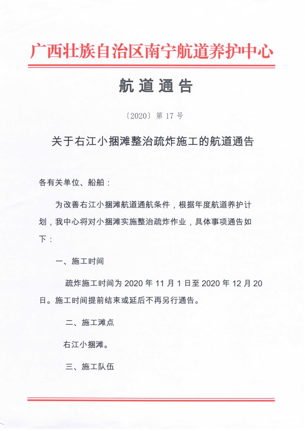 〔2020〕第17号 关于右江小捆滩整治疏炸施工的航道通告