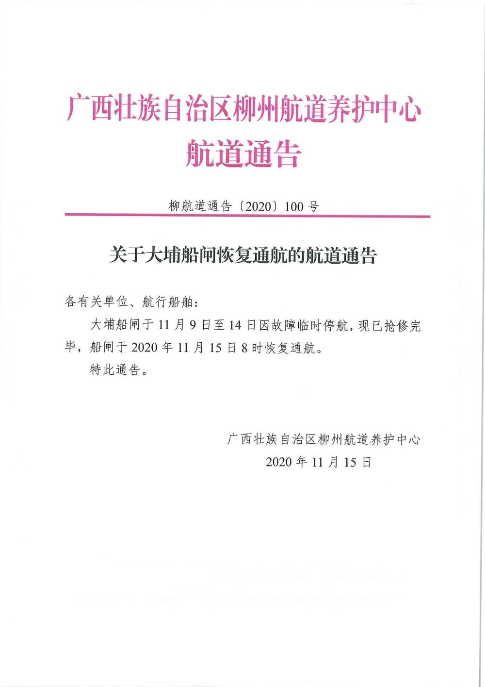 关于大埔船闸恢复通航的航道通告