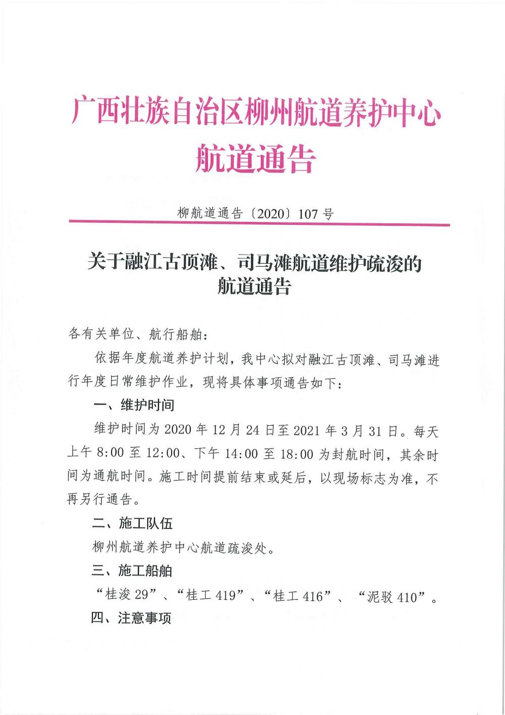 关于融江古顶滩、司马滩航道维护疏浚的航道通告