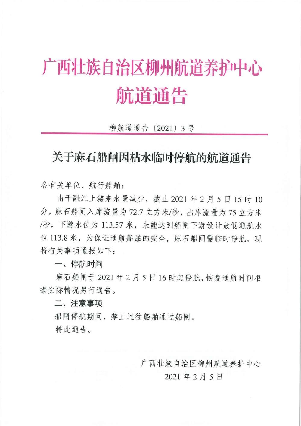 关于麻石船闸因枯水临时停航的航道通告