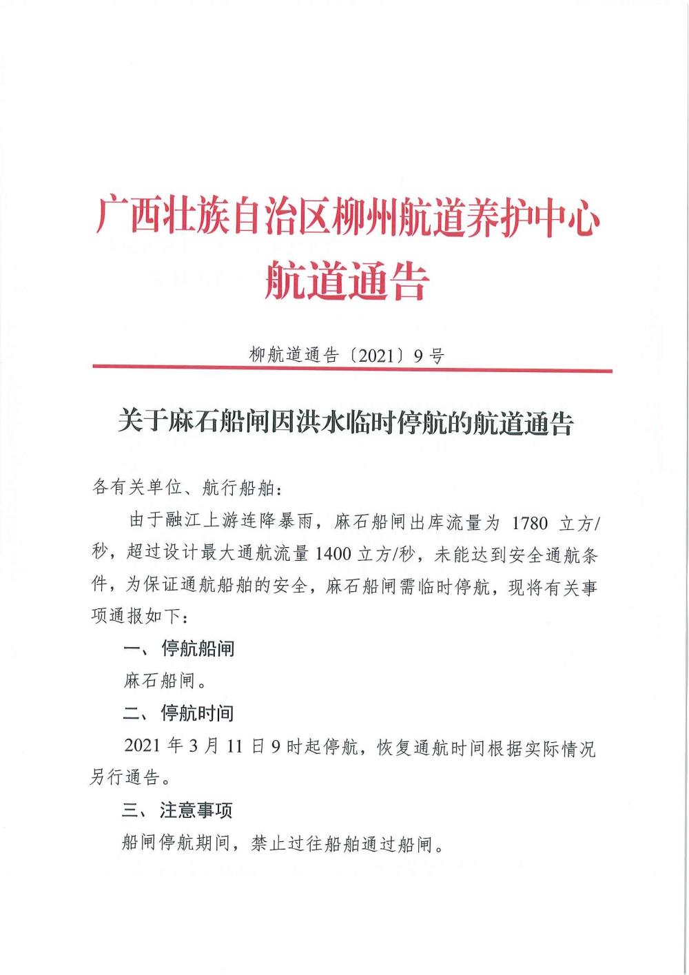 关于麻石船闸因洪水临时停航的航道通告