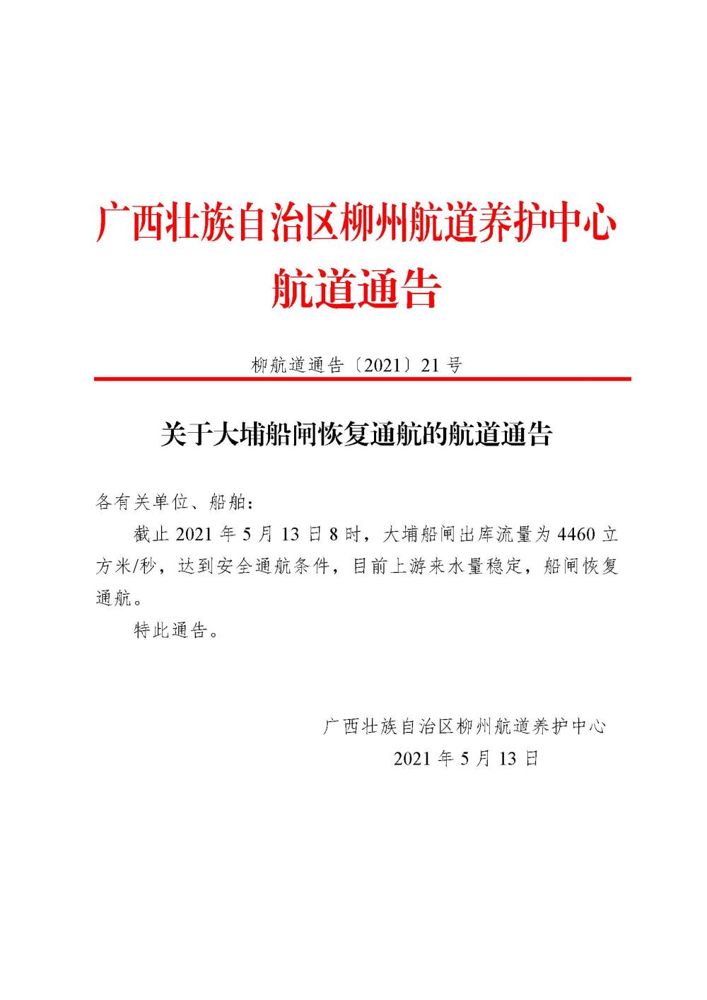 关于大埔船闸恢复通航的航道通告