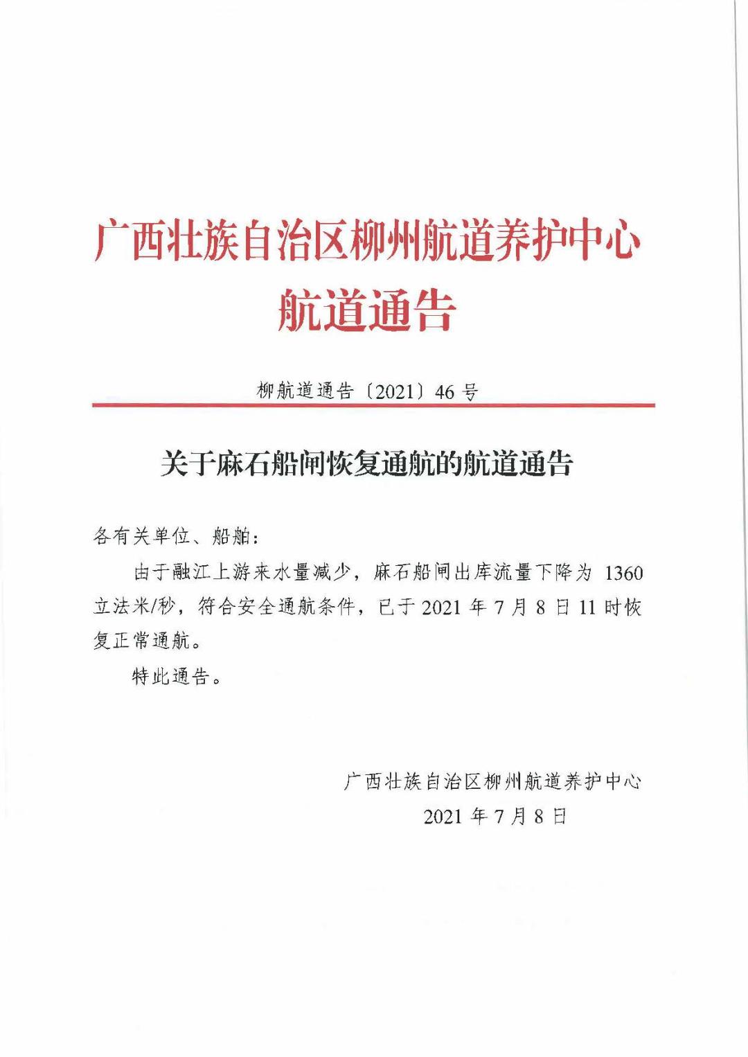 关于麻石船闸恢复通航的航道通告