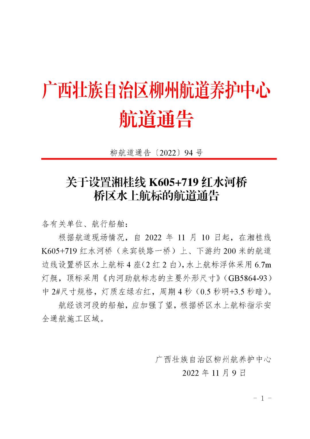 关于设置湘桂线K605+719红水河桥桥区水上航标的航道通告