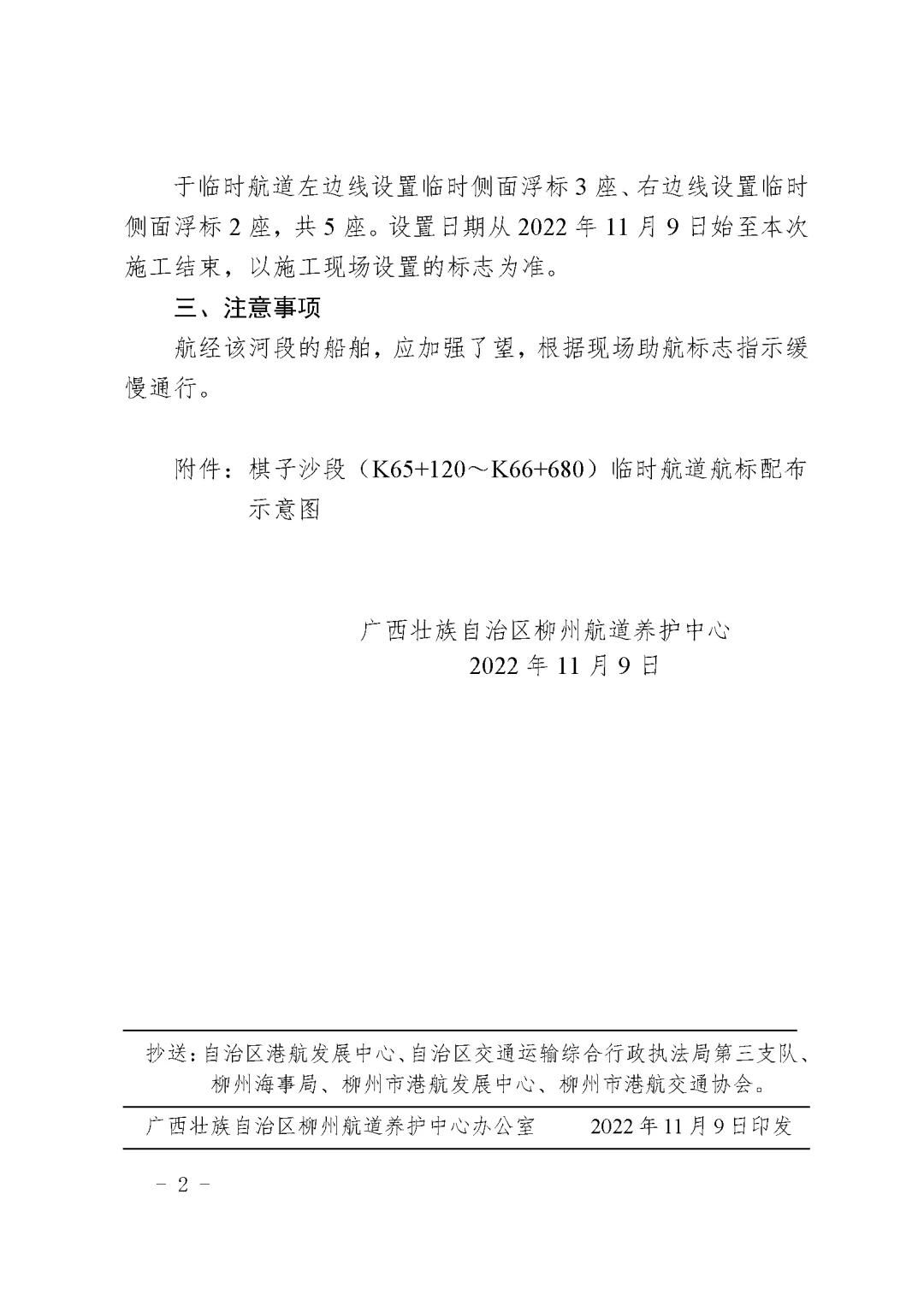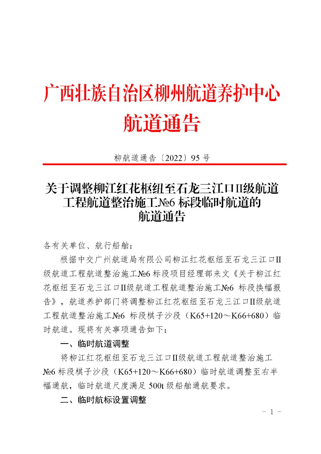 关于调整柳江红花枢纽至石龙三江口Ⅱ级航道工程航道整治施工№6标段临时航道的航道通告