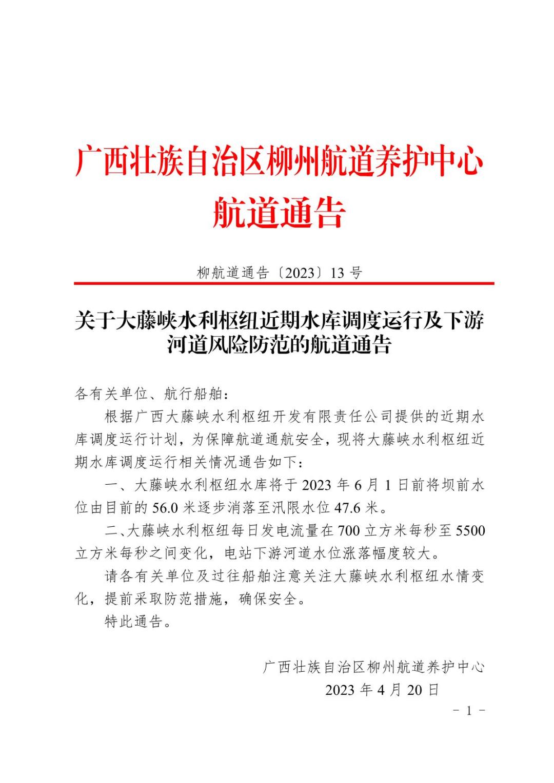 关于大藤峡水利枢纽近期水库调度运行及下游河道风险防范的航道通告