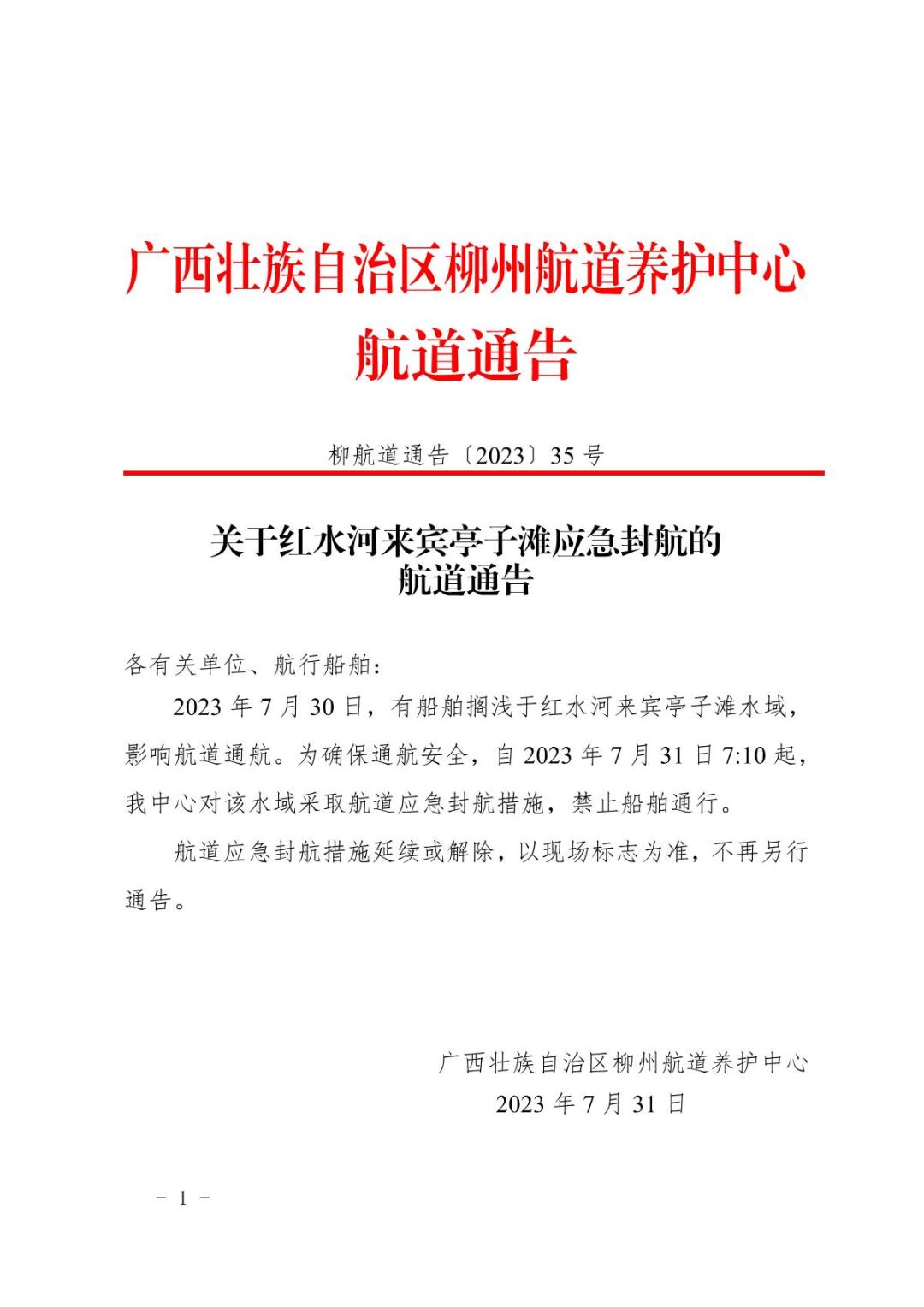 关于红水河来宾亭子滩应急封航的航道通告