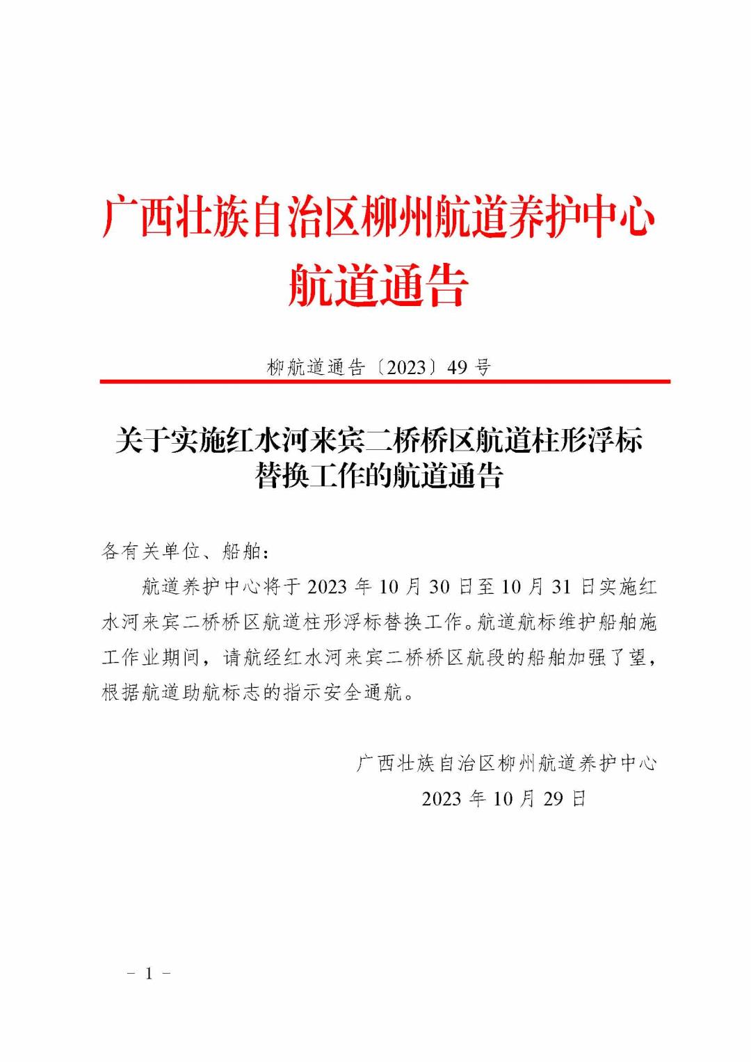 关于实施红水河来宾二桥桥区航道柱形浮标替换工作的航道通告
