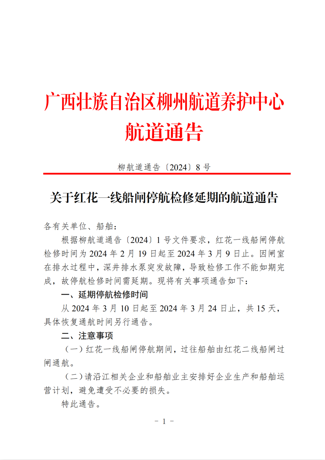 关于红花一线船闸停航检修延期的航道通告