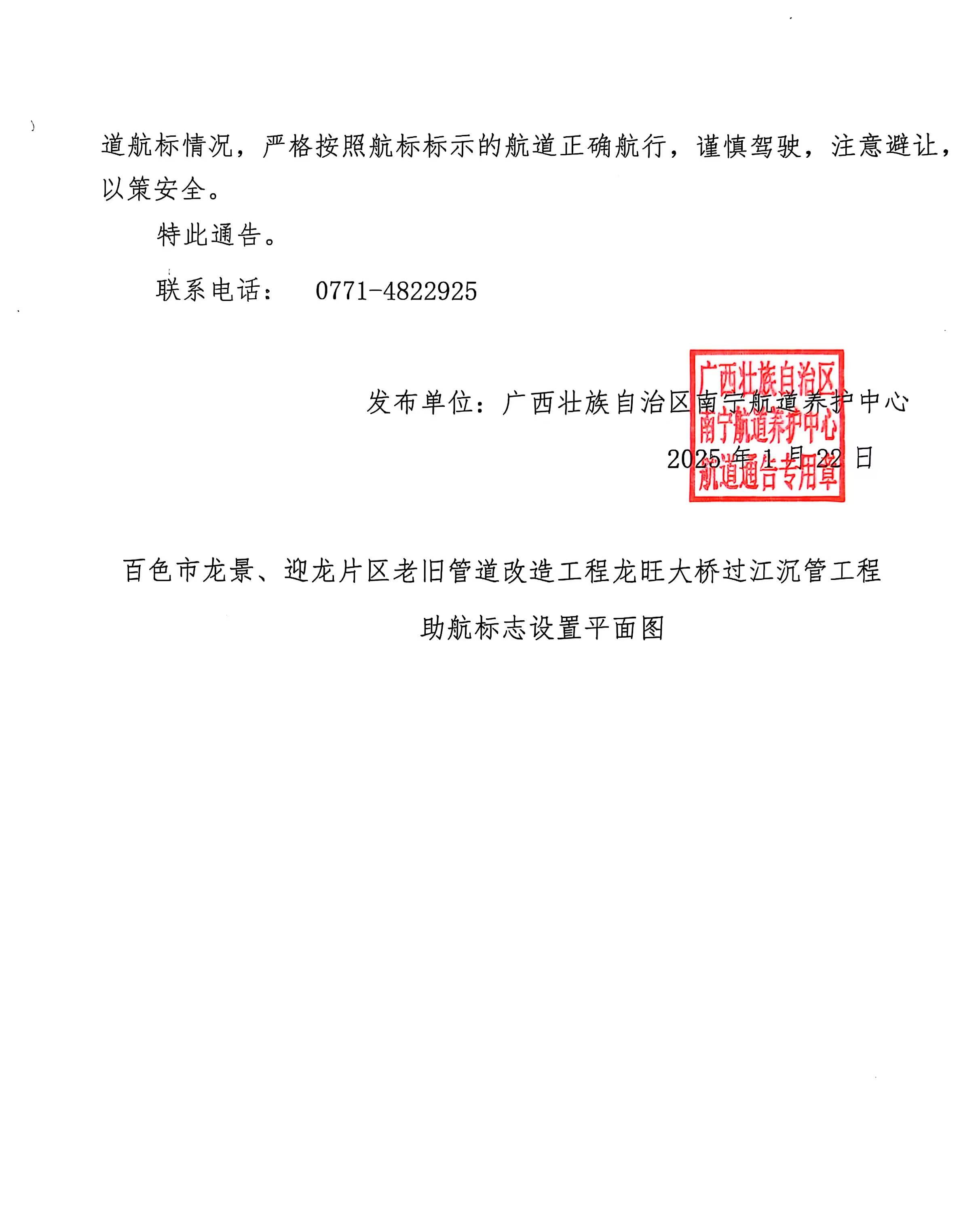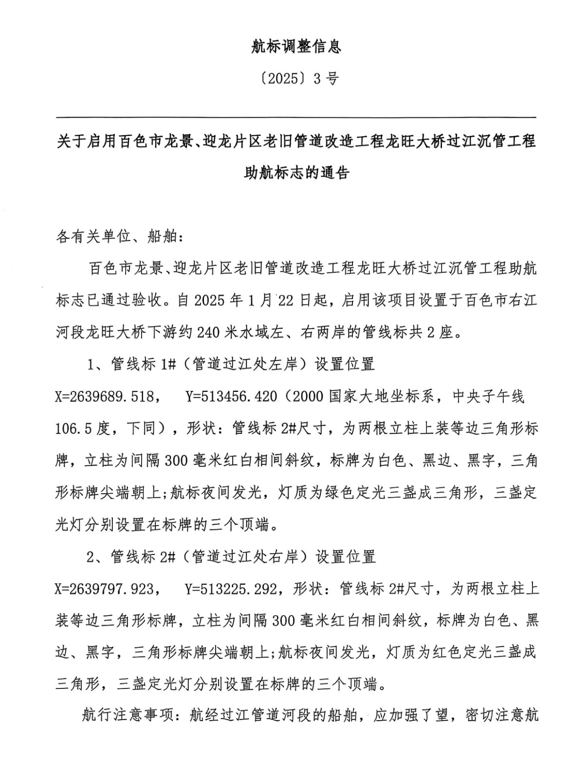 [2025]第3号关于启用百色市龙景、迎龙片区老旧管道改造工程龙旺大桥过江沉管工程助航标志的通告