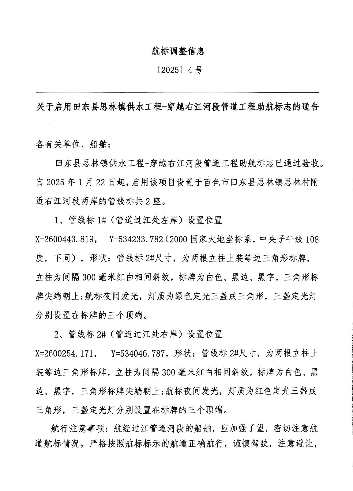 [2025]第4号关于启用田东县思林镇供水工程-穿越右江河段管道工程助航标志的通告
